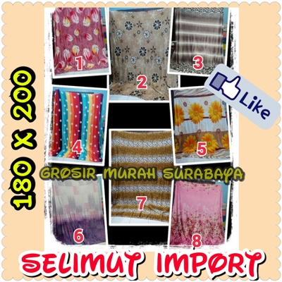 Grosir selimut import. Ukuran 180 x 200 cm. Bahan coral fleece. Banyak motif dewasa. Menerima pemesanan dan pengiriman barang ke luar kota atau luar pulau, transportasi mobil, kereta api dan kapal laut. Harga dijamin murah, bahkan bisa lebih murah dari harga pabrik. Hub bagian MARKETING - Holi, 0851-0155 4748, 0822 3030 8018, Pin BB : 7471244D.